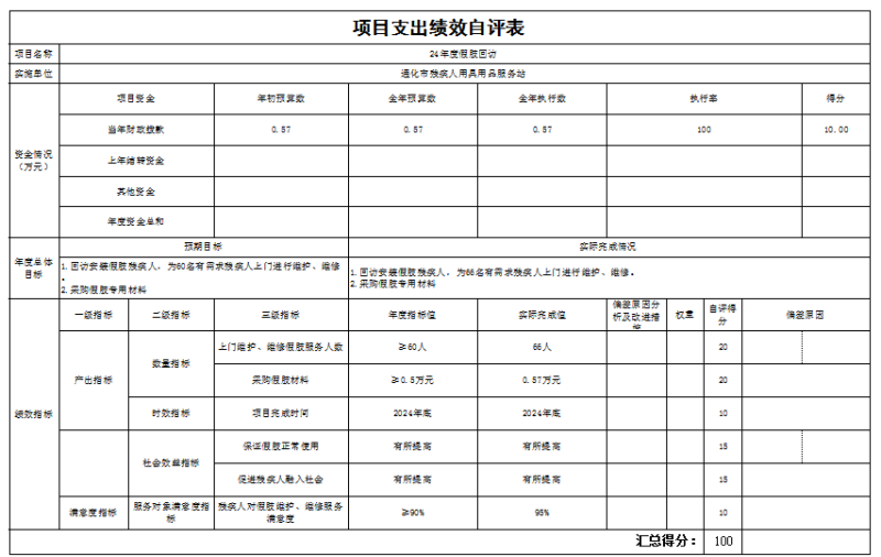 24年度假肢回访项目绩效自评情况:根据年初设定的绩效目标,项目绩效自评得分为100分。项目全年预算数为0.57万元,执行数为0.57万元,完成预算的100%。项目绩效目标完成情况:一是产出指标:上门维护、维修假肢服务66人;二是效益指标:保证假肢正常使用、促进残疾人融入社会都有所提高。